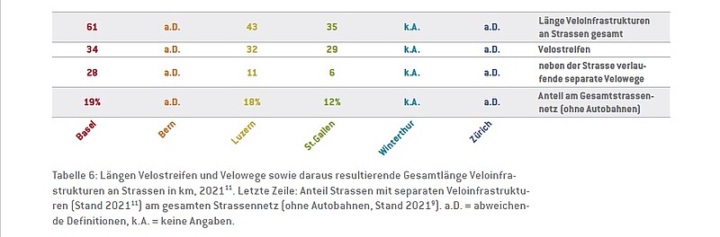 Inwieweit die Veloinfrastruktur einen Einfluss auf die Pendlerzahlen hat, kann in der Auswertung des Städtevergleichs nicht richtig berücksichtigt werden. Von Winterthur liegen keine Angaben zum Velonetz vor und die Städte Bern und Zürich verwenden unterschiedliche Definitionen für die Länge des Velonetzes, die nicht vergleichbar sind.