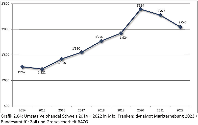 Weil der Verkauf konventioneller Velos stärker zurückging als derjenige von E-Bikes, nahm der Umsatz des Velohandels gegenüber dem Vorjahr aber nur um etwa 10 Prozent auf etwas mehr als zwei Milliarden Franken ab – deutlich weniger als in den beiden Vorjahren, aber trotzdem deutlich mehr als noch vor der Pandemie.