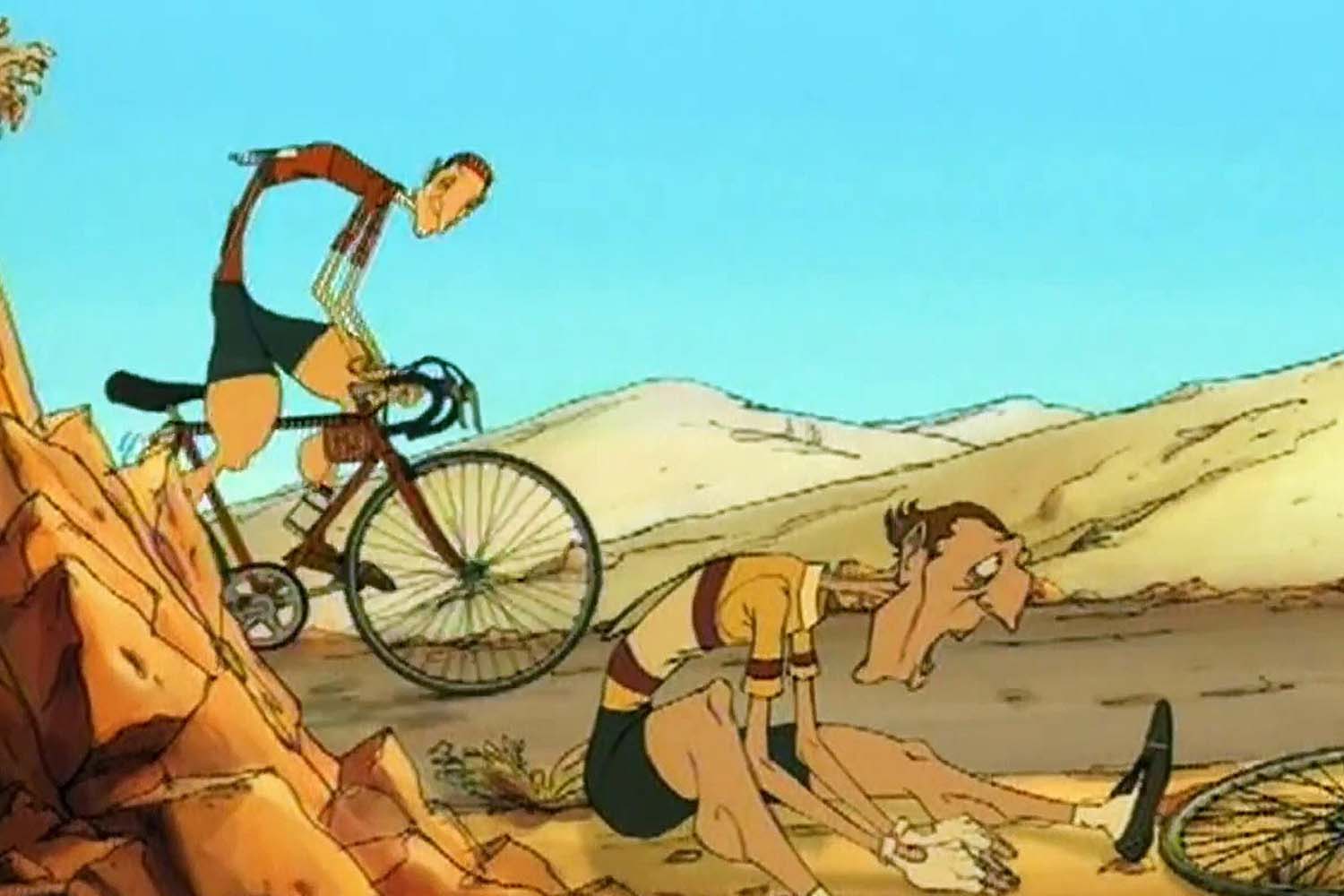 Der Zeichentrickfilm «Les Triplettes de Belleville» besticht mit skurrilen und teilweise bis ins Groteske überzeichneten Figuren. Im Film erhält der kleine Champion von seiner Oma ein Velo geschenkt und ist sogleich begeistert. Als junger Mann kennt er nur ein Ziel: die Teilnahme an der Tour de France. Während des Rennens wird er von Gangstern entführt und muss diesen als Radfahrsklave dienen. Oma Souza nimmt die Verfolgung auf.