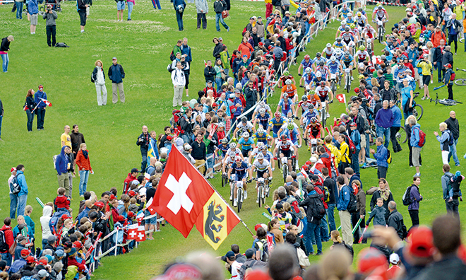 Eine Staffel-Wettkampfrunde ums Bundeshaus mit Start und Ziel auf dem Bundesplatz? Das gibts nur in der Schweiz! Da hat wohl manch ausländischer Besucher gestaunt, der Zeuge des packenden Schauspiels vor beeindruckender Kulisse wurde. Dem Schweizer Quartett mit den Weltmeistern Nino Schurter und Jolanda Neff als Aushängeschilder blieb – wie im Vorjahr – der Ehrenplatz hinter der Auswahl Italiens. Launige Reden des Berner Stadtpräsidenten Tschäppät («Wir brauchen zwar eure Steuerbatzen, aber dafür geben wir euch auch etwas …») und von Regierungsrat Rickenbacher eröffneten die Titelkämpfe, die vom 20. bis 23. Juni dauerten. Tags darauf die gleiche Szene im Rahmen der ersten Eliminator-Sprint-EM. Bundesparlamentarier, die sich in der Session mit der «Lex USA» zu befassen hatten, nutzten die willkommene Abwechslung vor der Haustüre des Parlamentsgebäudes – obschon Mountainbiking ursprünglich ebenfalls aus Amerika stammt.