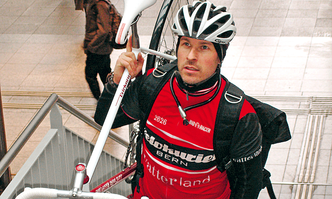 Seit zwei Jahren tritt Splint als Kurierfahrer und ausgebildeter Mountainbikelehrer etwas kürzer. Er arbeitet jetzt Teilzeit als Velomechaniker im Velokurierladen. Und vor zehn Monaten ist er zum zweiten Mal Vater geworden. Zusammen mit seiner Frau Nathalie führt er einen autofreien Haushalt. Zwei Veloanhänger gehören zum Velofuhrpark. Kürzlich kam noch ein Rennvelo dazu – ein Unikat mit Scheibenbremsen: Splint baute es im Laufe eines Rahmenbaukurses selbst zusammen. Der gelernte Möbelschreiner und spätere Modellbauer hat ein Faible für Werkstoffe und Fertigungstechniken. Löten sei aber etwas vom Schwierigsten gewesen, das er gelernt hat. Jetzt, wo sein Traumvelo im Einsatz steht, ist Schluss mit dem Rahmenbau. Sein neustes Projekt ist eine Postkartenedition – natürlich mit Velosujets. Mit 15 Jahren begann er zu fotografieren. Einige seiner Fotos wurden im 2008 publizierten Buch zum 20-Jahr-Jubiläum der Berner Velokuriere veröffentlicht.