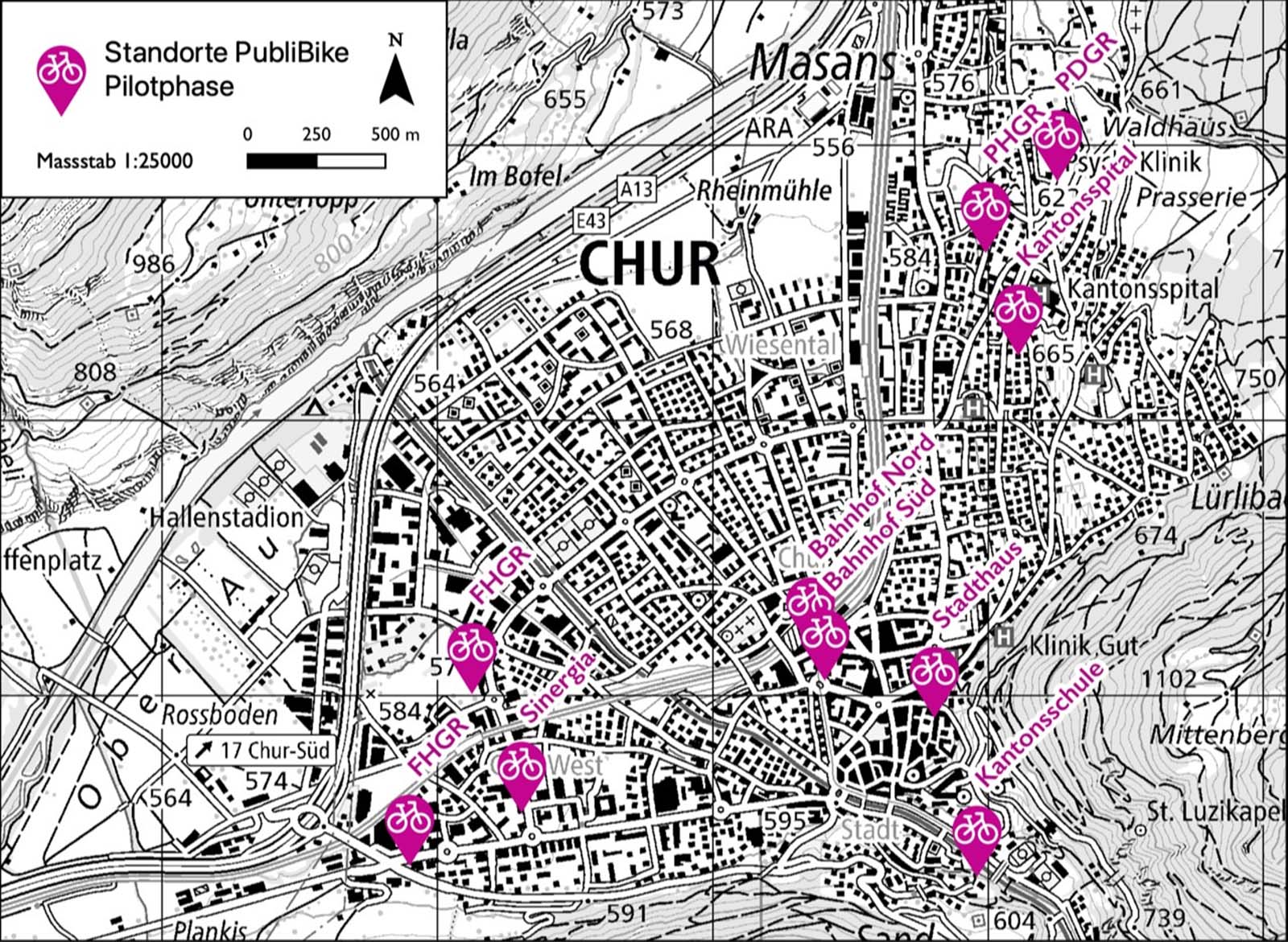 Zum Start der Pilotphase besteht das Bikesharing-Netz in der Stadt Chur aus zehn Stationen. (Bild: ZVG)