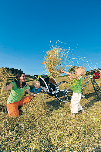 Kinderanhänger können weit mehr, als nur einfach hinter dem Velo herzurollen. Die meisten Modelle lassen sich im Handumdrehen mit kleinen Zusatzrädern zum Kinderwagen umbauen. So kommt man mit den Kids nicht nur bis zum Eingang der Badi, sondern mit der ganzen Chose direkt an den Bassinrand. Oder man fährt mit dem Velogespann in die Stadt und setzt den Bummel in der Innenstadt zu Fuss fort. Mit einem dritten Rad und einer Handbremse bieten sich die Fahrzeuge auch zum Joggen oder Inlineskaten an.