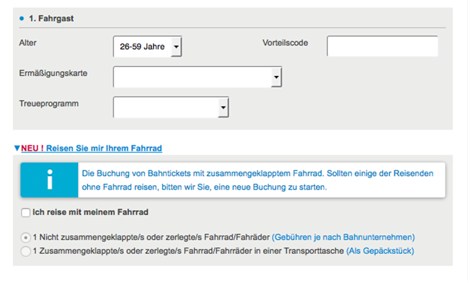 Die französische SNCF sagt von sich selbst, sie sei weltweit die einzige Bahngesellschaft, die in einigen ihrer Hochgeschwindigkeitszüge die Velomitnahme akzeptiert. Die Aussage stimmt: Selbst im fernen China, früher das Veloland Nummer 1 und heute der Staat mit dem grössten Hochge­schwindigkeitsnetz der Welt, darf man das Velo nicht mit in den Zug nehmen. Anders in der Grande Nation: Dort kann man schon seit Längerem in vielen TGV das Velo für 10 Euro als unverpacktes Handgepäck mitführen. Allerdings war es bis vor Kurzem gar nicht so einfach, den Veloplatz im Zug zu reservieren. Der Schreibende ist mehrfach an der SNCF-Service-Nummer gescheitert, und auch beim SBB-Schalter bekundete das Personal zuweilen Mühe, eine solche Reservation zu tätigen. Das ist jetzt vorbei. Seit dem Fahrplanwechsel im letzten Dezember kann man die Reservation zusammen mit dem Zugbillett online erledigen. Wer sein Ticket online bei ch.voyages-sncf.com/de bucht, muss nach der Eingabe der Fahrstrecke «Suchoptionen ändern» eingeben. Dann erscheint unten rechts: «Neu: Reisen Sie mit Ihrem Fahrrad!» Nach dem Klick auf die Schaltfläche kommt die Frage, ob das Velo verpackt und zerlegt oder eben unverpackt mitreist. Einfacher geht es nicht – Gratisverlad ausgenommen. Den gibt es nur in den französischen TER- Regionalzügen. Für die IC-(Intercités-)Züge hingegen gelten die gleichen Bedingungen wie für den TGV.