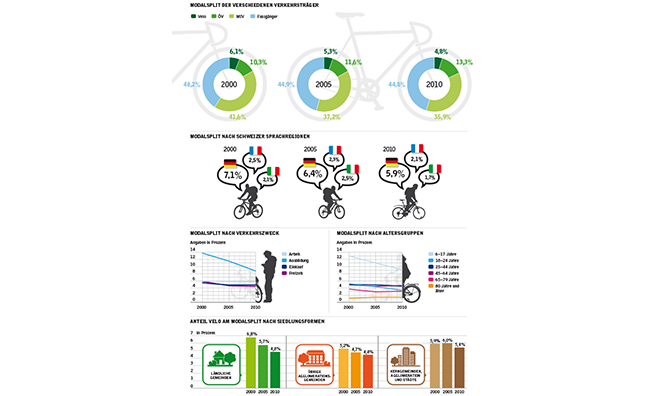 Die Bewohnerinnen und Bewohner der Schweiz fuhren 2010 weniger Auto und benutzten häufiger den ÖV, das die gute Nachricht. Die schlechte ist, dass weniger als 5 Prozent aller zurückgelegten Strecken per Velo erfolgen. Während die 45 bis 79-Jährigen wieder vermehrt in die Pedale treten, verringert sich die Velonutzung bei der Jugend konstant. Jugendliche und junge Erwachsene setzen vermehrt auf den ÖV, was auch mit sozialen Aspekten zu tun hat.