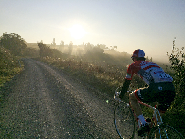Die Routen erstrecken sich über Distanzen zwischen 35 und 205 Kilometern, wobei Letztere in den Süden bis nach Montalcino führt, wo das Gelände etwas lieblicher und offener wird. Die ersten werden noch in stockdunkler Nacht befahren, bereits um 5 Uhr früh wird gestartet an diesem ersten Oktobersonntag. Eineinhalb Stunden lang werden die Fahrer nur vom Lichtfleck des eigenen Scheinwerfers geleitet – das hat fast schon meditative Züge. Die Furcht, in der Dunkelheit über Kiessträsschen zu rollen, ist rasch verflogen.
