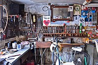 Nützlich ist eine kleine Werkbank mit einer Tiefe von mindestens 50 Zentimeter, damit ein Rad bequem abgelegt werden kann. Praktisch ist ein kleiner Schraubstock, der am einen oder anderen Ende montiert ist. Die Arbeitsfläche muss gar nicht gross sein. Denn wie sagt doch die alte Mechanikerweisheit: je grösser die Werkbank, desto grösser das Puff.
