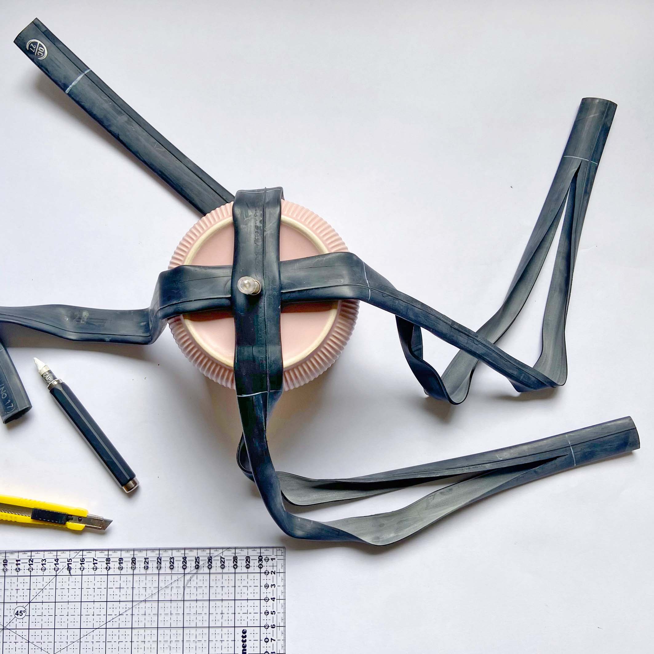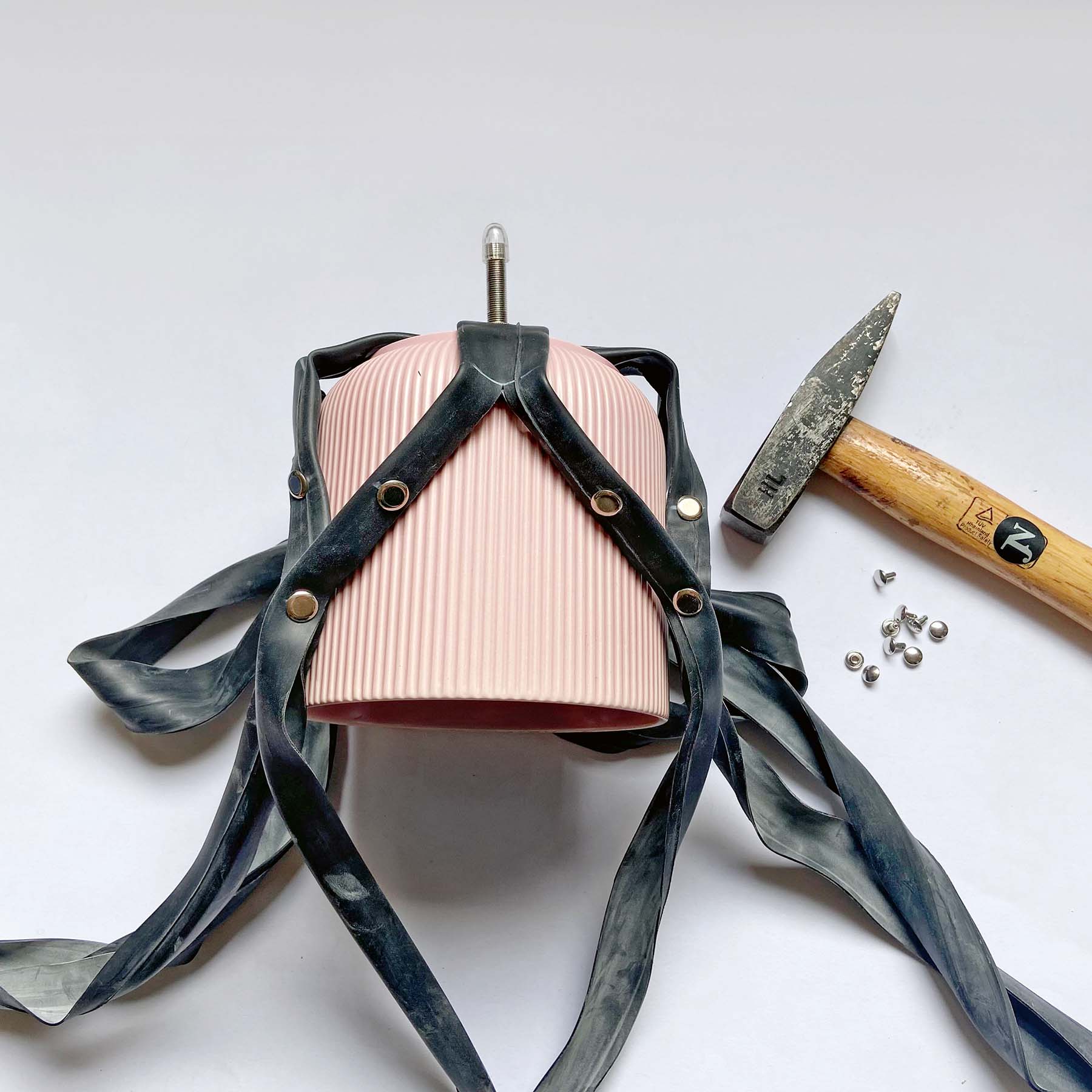 Blumentopf ohne Loch, alte (Renn-)Veloschläuche, kleine Nieten *, grosse Ösen *