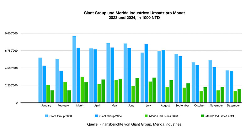 Als börsenkotierte Unternehmen geben die Giant Group und Merida Industries ihre Umsatzzahlen Monat für Monat zeitnah bekannt. Nachdem die beiden grössten Velo- und E-Bike-Produzenten Taiwans im Jahr 2023 im Vergleich zum Vorjahr empfindliche Einbussen beim Umsatz hatten hinnehmen müssen, zeigt sich ein Jahr später ein differenzierteres Bild.
