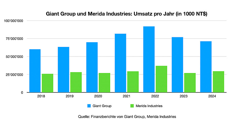 Nach einigen Jahren des Wachstums schmerzte der Einbruch der vergangenen Jahre. Aber die Umsätze von Merida Industries und Giant Group liegen 2024 über dem Niveau von 2020. (Grafik: Velomedien)
