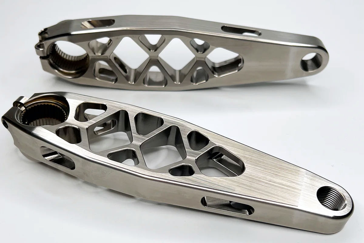 Die Kurbeln bietet 5DEV passend für DUB Boost oder Boost-Innenlager und mit passenden Achsbreiten für Anwendungen von Gravel bis Enduro. Ausser einer verstärkten, mit Cam Zink entwickelten Freeride-Variante wird je eine Aluminium- und Titan-Variante mit vielen fachwerkartigen Aussparungen angeboten - für konventionelle Mountain Bikes wie für E-MTBs. Denn die Aluminium-Kurbeln sind bereits ab 135mm Länge und passend für Antriebssysteme von Fazua, Bosch eBike Systems, Brose, Spezialized SL, TQ, Shimano und SRAM erhältlich. Für Shimanos «EP8»- und Specialized «Levo»- und «Kenevo»-Mittelmotoren gibt es gar Titankurbeln.