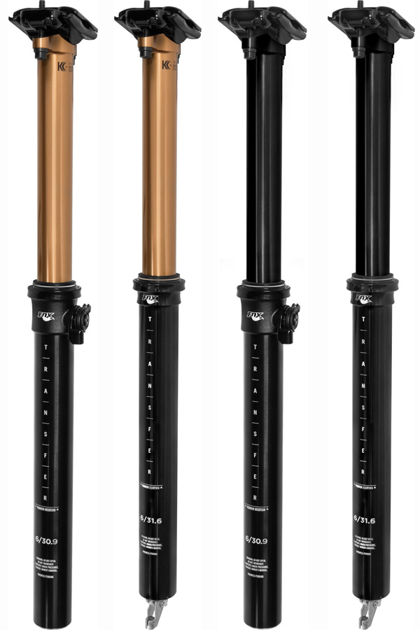 Um auf dem Erstausrüstungs- wie auf dem Nachrüstmarkt möglichst viele Bedürfnisse abdecken zu können, bietet Fox die "Transfer"-Stütze in verschiedenen Varianten: So kommt das Standrohr der "Transfer Factory" mit dem bereits von den Factory-Gabeln und -Federbeinen bekannten, optisch auffälligen Kashima-Coating, während das Standrohr bei der günstigeren "Transfer Performance"-Stütze schwarz anodisiert ist. Zudem hat man die Wahl aus Varianten mit interner oder externer Zuganlenkung, wobei sich der Kabelstopp bei letzterer um 60 Grad in beide Richtungen drehen lässt, um eine möglichst reibungsarme und saubere Zugführung zu ermöglichen. Bezüglich der Einbaumasse deckt Fox mit 30.9 und 31.6 Millimetern die gängigsten Dimensionen ab, und beim Hub werden Varianten mit 100, 125 oder 150 Millimetern geboten.