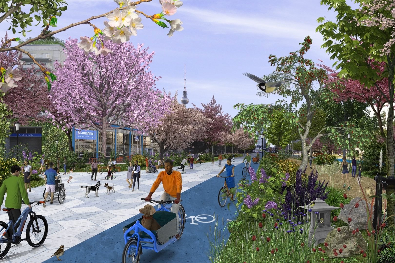 Daran glaubt zumindest Jan Kamensky. Der visuelle Utopist, wie er sich selbst nennt, kreiert kurze animierte Filme, in denen er autodominierte Strassen in menschenfreundliche Orte umwandelt. Die bestehende Autoinfrastruktur ersetzt er durch Fuss- und Radwege oder Plätze zum Verweilen. Im Rahmen des Future Cities Projekt des Unternehmens Shimano Europe, das erstmals vom 13. bis 17. Juli 2022 auf der Eurobike in Frankfurt am Main präsentiert wurde, hat sich der Hamburger der Karl-Marx-Allee in Berlin und der Marble Arch in London angenommen.