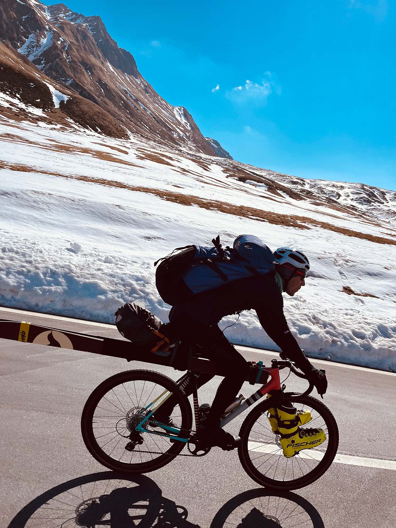 In der Übergangsphase im Frühling 2021 fiel mir der Entscheid schwer, mich für die Ski oder das Velo zu entscheiden. So entschloss ich mich, meine zwei Passionen Velo- und Tourenskifahren zu verbinden: konsequent eine Linie von A nach B fahren, mit eigener Muskelkraft. Komme, was wolle.