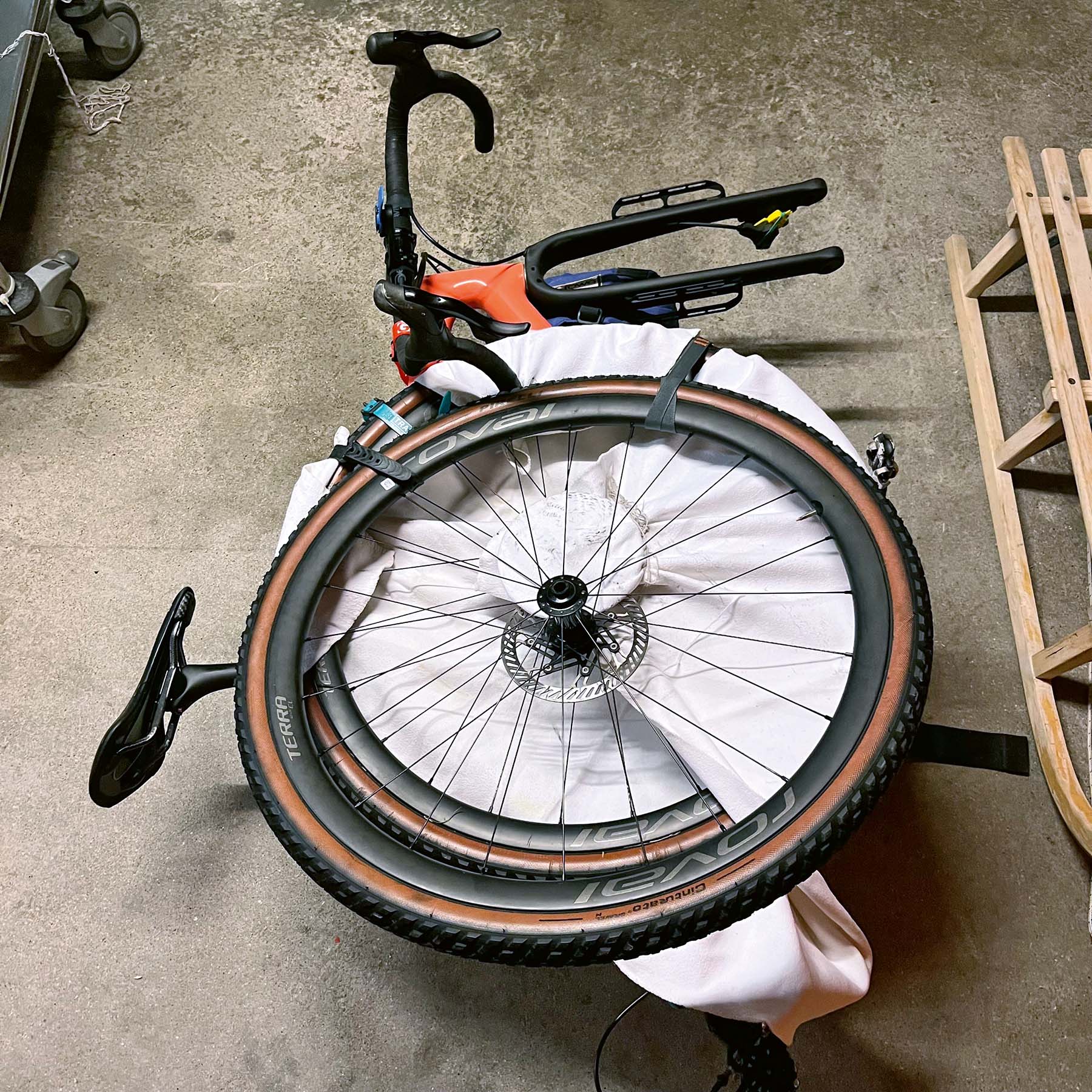 Das ist wie das Schichten einer Lasagne, ein Rad, dann das nächste Rad. Damit das Ganze nicht instabil wird, muss alles gut festgezurrt werden. Das Velo darf auch keinen Schaden nehmen, zum Schutz verwende ich zwischen den Schichten einen alten Molton.