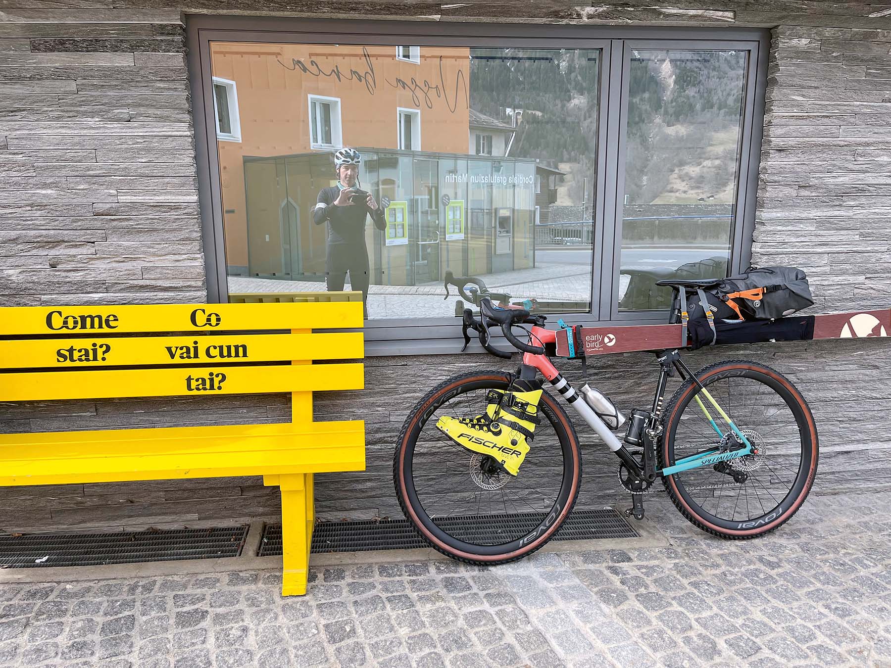 Um die richtige Spur zu finden, muss ich verstehen, wie sich Wetterverhältnisse und Schneebedingungen verändern. Dafür werde ich mit unvergesslichen Erlebnissen belohnt, wie ich sie sonst nur in Kirgisien mit dem Velo erlebte: absoluter Ruhe. Die geschlossenen Pässe, kein Verkehr, keine Menschen weit und breit. Aber auch etwa eine wunderbare Minestrone in der höchstgelegenen Enothek Italiens, nach einer beschwerlichen Splügenpassüberquerung, im Albergo della Posta in Montespluga.