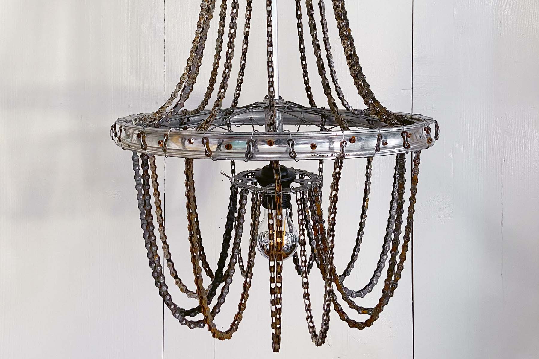 Velojournal zeigt zum Jahresende, wie man aus alten Veloketten, einem Rad, einer Bremsscheibe, Ritzel und Bremskabel einen echten Hingucker baut, der die gute Stube erhellt.