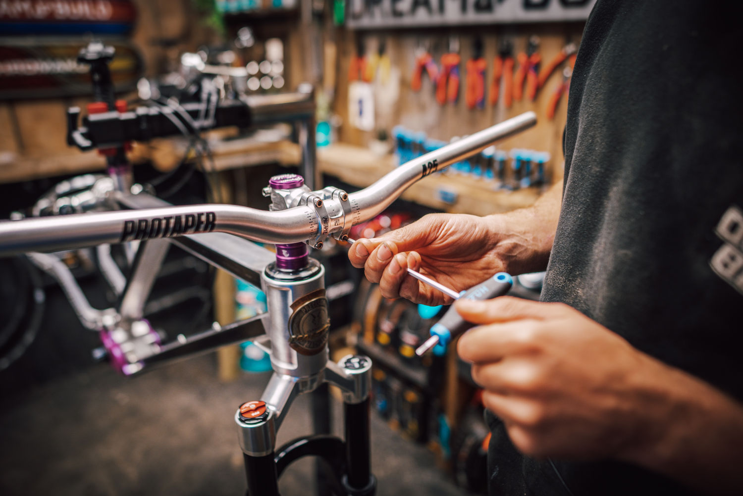 Komplettiert wird der «FS II»-Aufbau mit feinen Teilen der Hayes Bicycle Group: Für kraftvolle Verzögerung sorgen «Dominion»-Vierkolben-Scheibenbremsen in der limitierten «Purple Hayes»-Ausführung. Reynolds steuert «309 Enduro»-Laufräder und Pro Taper Teile wie Lenker, Vorbau und Sattelstütze bei. Dazu kommen eine «Mattoc»-Federgabel, Reifen von Schwalbe, ein Sattel von Ergon und eine Auswahl an Teilen von Wolf Tooth. Der Aufbau des futuristischen Retro-Mountainbikes erfolgte in Form eines «Dream Builds» (Link) in der Werkstatt von Gee Milner - Prädikat absolut sehenswert!