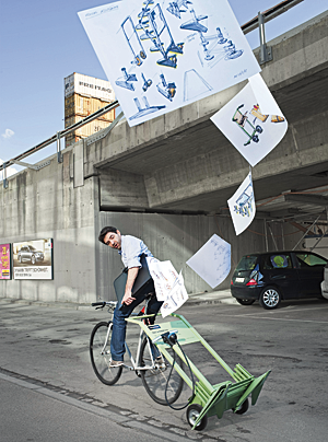 Die als Taschenherstellerin bekannte Firma Freitag verleihtseit Neustem Fixies. Diese Räder mit Starrlauf-Räder kommen ursprünglich vomRennsport – aus dem Velodrom. Mit ihrem Fixie-Verleih kehren die GebrüderFreitag zurück zu ihren Wurzeln, denn mit einer Fahrradkurier-Tasche hat vorfast zwanzig Jahren alles angefangen. Zusammen mit dem Designer Matthias Zähhaben Daniel und Markus Freitag einen mobilen Fahrradständer entwickelt, der aucheine Servicestation mit Werkzeugkiste und Pumpe ist.