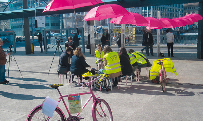 Genf ist die Hauptstadt des Autos und des jährlich stattfindenden Autosalons. Unter dem Titel «L’autre Salon» organisiert Pro Velo Genève mit anderen Organisationen seit einigen Jahren Gegenaktivitäten für alle Nichtmotorisierten. Nebst Konventionellem wie Kino, Veloausfahrt und Picknick finden sich im Programm einige Veranstaltungen, die aus dem Rahmen fallen. In diesem Jahr startete «L’autre Salon» besonders sinnbildlich: Am Quai de l’île wies Pro Velo mit rosaroten Fahrrädern, Regenschirmen und Hockern auf die fehlenden Mietvelos – auf französisch «vélos en libre service» –, Dächer und Sitzgelegenheiten hin. Selbstbedienung war das Stichwort und die Botschaft an die Stadt, mit diesen Angeboten vorwärts zu machen. Die originelle Idee und die farbenfrohe Umsetzung brachte den Initianten einen Bericht im Westschweizer Fernsehen ein.