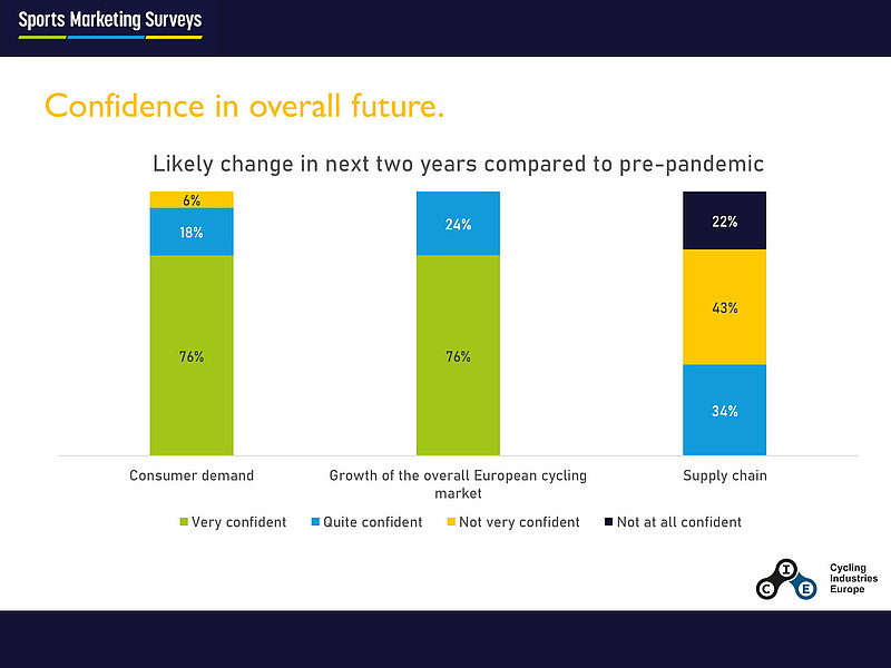 Hier zeigt sich, dass die weit fortgeschrittene, globale Arbeitsteilung die Veloindustrie anfällig für Störungen werden lässt. Dabei bezeichneten 64 Prozent der Unternehmen die Probleme in der Zulieferkette als bedeutend oder sehr bedeutend. Beachtliche 43 Prozent der Unternehmen erwarten in den kommenden beiden Jahren eher keine Besserung der Situation und 22 Prozent sehen gar keine Chance auf eine Normalisierung der Lage.