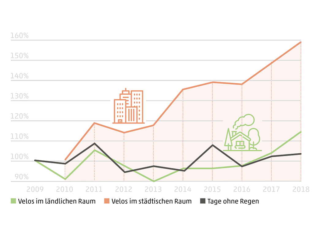 Bei Schweiz Mobil laufen alle Fäden zusammen. Die Stiftung betreibt eine nationale Datenzentrale, in welche die Messungen der Städte und Kanton einfliessen. «Im städtischen Raum ist in den letzten Jahren eine starke Zunahme des Veloverkehrs zu beobachten. Im ländlichen Raum hat der Veloverkehr ebenfalls zugenommen. Die Zunahme ist aber weniger deutlich als im städtischen Raum», steht im jüngsten Bericht von Schweiz Mobil zu lesen.