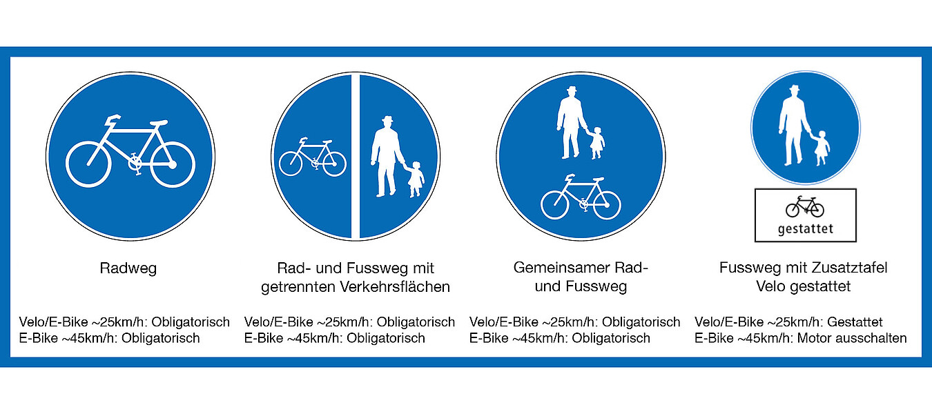 E-Bikes mit einer stärkeren Tretunterstützung bis 45 km/h, sogenannte «schnelle E-Bikes» dürfen grundsätzlich die gleichen Verkehrsflächen wie Velos benutzen, müssen an einigen Orten aber den Motor ausschalten.
