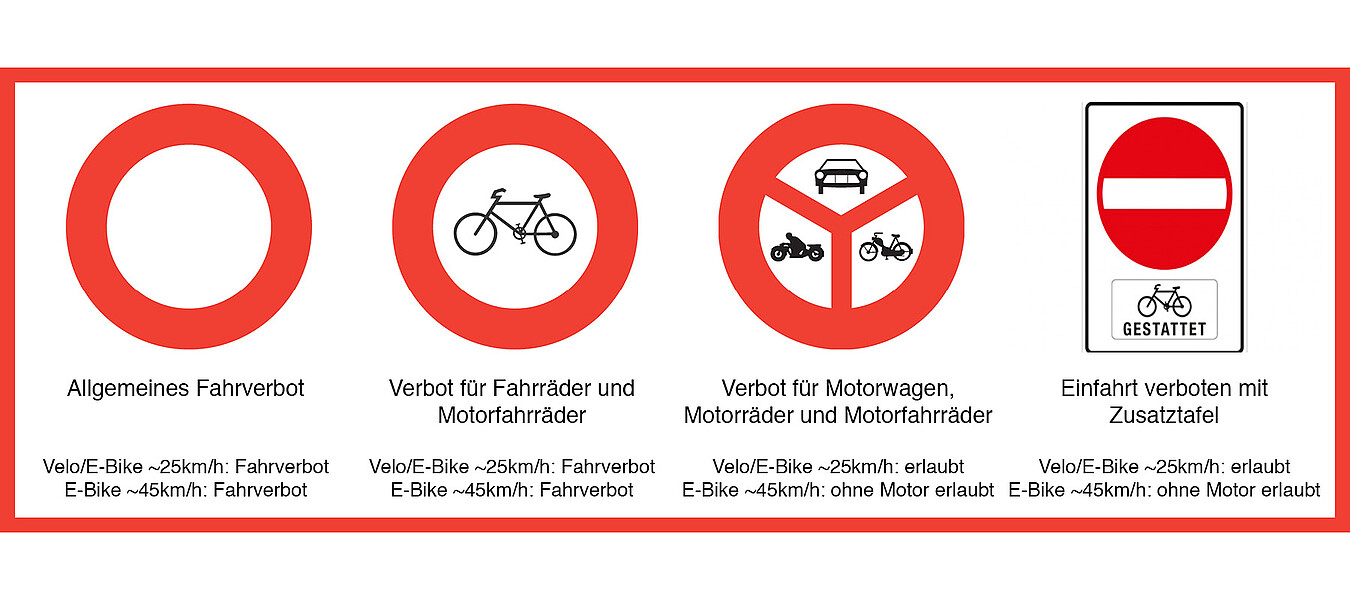 Ebenso wenig dürfen Zweiräder auf Strassen mit allgemeinem Fahrverbot oder einem «Verbot für Fahrräder und Motorfahrräder» verkehren.