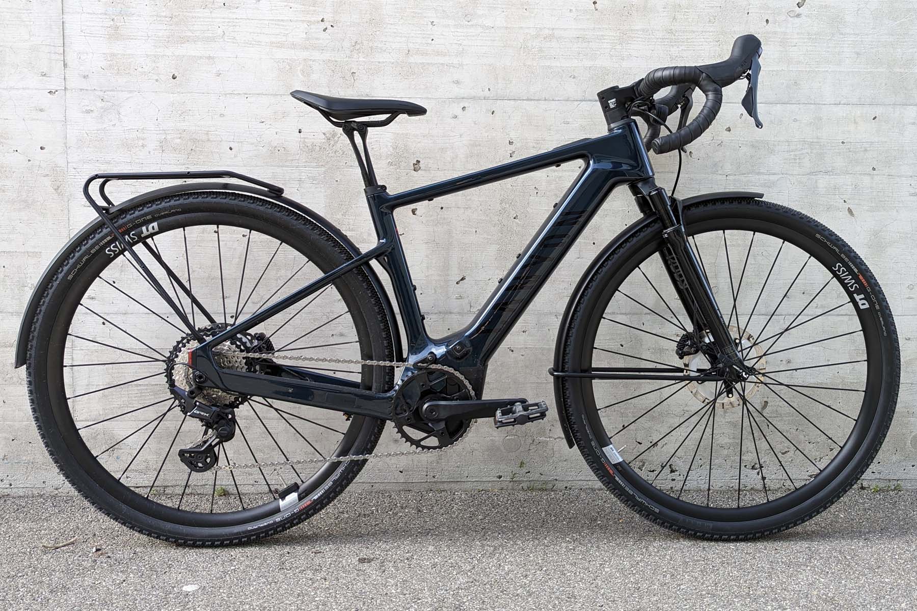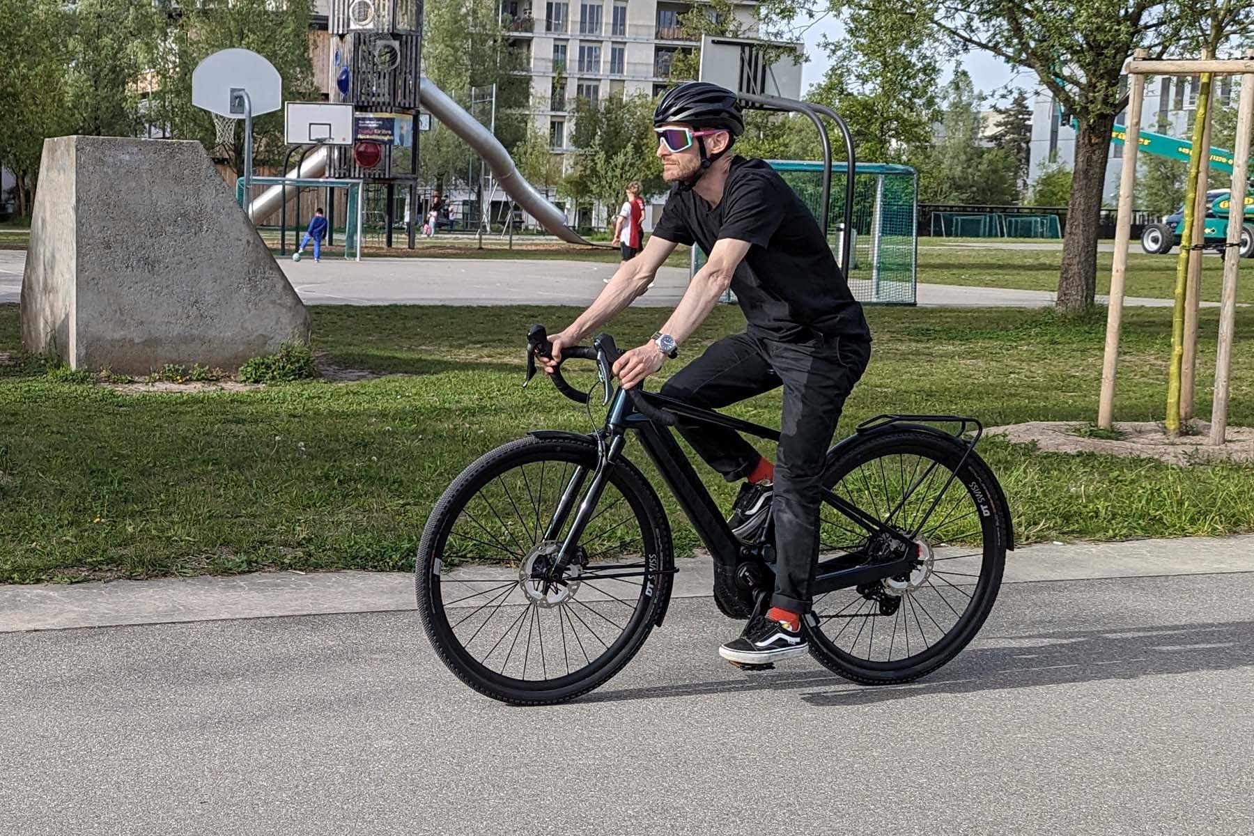 Äusserst positiv zum Fahreindruck tragen die Geometrie des Carbonrahmens und die Federgabel bei. Die Sitzposition ist komfortabel – aber nicht zu komfortabel, sodass sich auch sportliches Fahren gut anfühlt. Toll: Selbst beim XS-Rahmen des Testvelos ist die Fussfreiheit genügend gross, sodass der Fuss auf dem Pedal weder Vorderrad noch Schutzblech berührt. Keine Selbstverständlichkeit bei kleinen Rahmengrössen.
