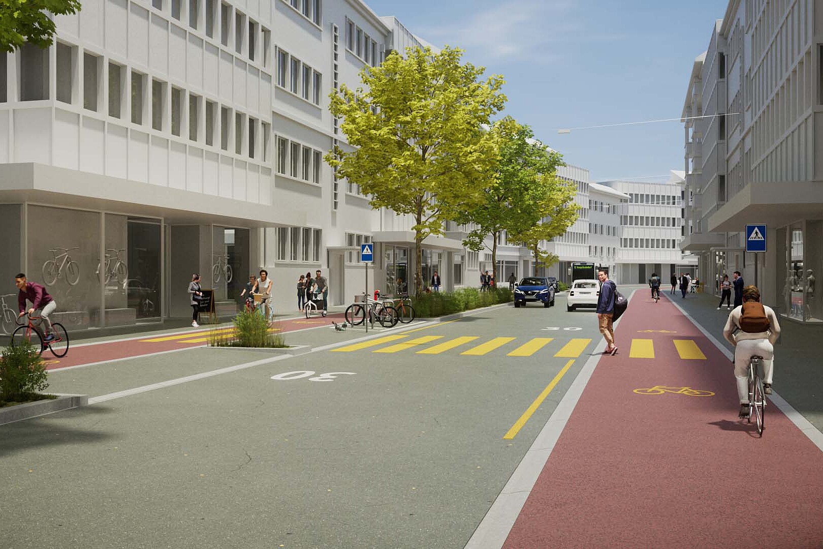 Der heutige Strassenraum ist für den Veloverkehr ungenügend und gefährlich (Bild 1). Es braucht mehr Platz und eine Fehler verzeihende Infrastruktur (Bild 2). (Bilder: Velokonferenz Schweiz / co.dex production ltd. & Julien Joliat)