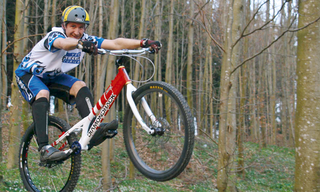 Jedes Velomodell und jede Geländeart ist für René von Dach eine Herausforderung. Da, wo Steuerkünste gefragt sind, ist der 38-Jährige gerne dabei. So stehen neben Trial-Velos bei ihm zu Hause in Urdorf auch Mountainbikes, ein Single-Speeder, ein Rennvelo, ein geländetaugliches Einrad und sogar ein voll gefedertes Mountainbike-Tandem. Mit Letzterem bestritt er bereits mehrmals zusammen mit unterschiedlichen Mitfahrern das berüchtigte Langstreckenrennen Swiss Bike Masters in Küblis. Seine grösste Aufmerksamkeit widmet der gelernte Elektromonteur, der heute als Network Operator in Zürich Altstetten arbeitet, nach wie vor dem Velo-Trial.
