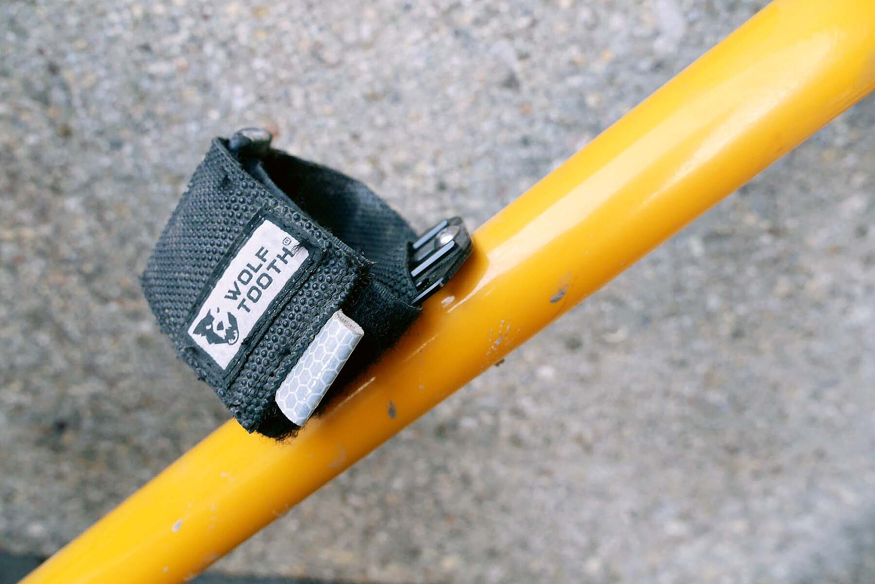 Es lohnt sich, dieses Band optimal zu positionieren, damit anschliessend mit nur einem Handgriff gepackt werden kann. Das Klettband ist genug breit, sodass das Gepäck auch nach tagelanger Fahrt auf losem Untergrund noch fest am Rahmen hält. Leider ist der Reflektor am Ende des Klettbandes so klein, dass er die Sichtbarkeit nicht erhöht. Dafür nervt er beim Einfädeln des Bandes in die Platte.
