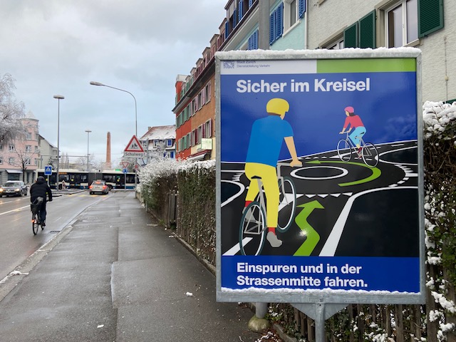 Im Kreisverkehr soll in der Mitte der Fahrbahn gefahren werden. Dafür bereits vor dem Kreisel in die Mitte der Fahrspur einfädeln. Im Kreisel haben Fahrzeuge, die von Links kommen, Vortritt. Tut sich eine genügend grosse Lücke auf, um in den Kreisel zu fahren, zügig in die Mitte fahren. Immer genügend Abstand zu anderen Fahrzeugen halten, sodass jederzeit gebremst werden kann. Im Kreisel soll nicht überholt werden. Auch keine Velofahrenden. Zum Verlassen des Kreisels deutliches Handzeichen geben.