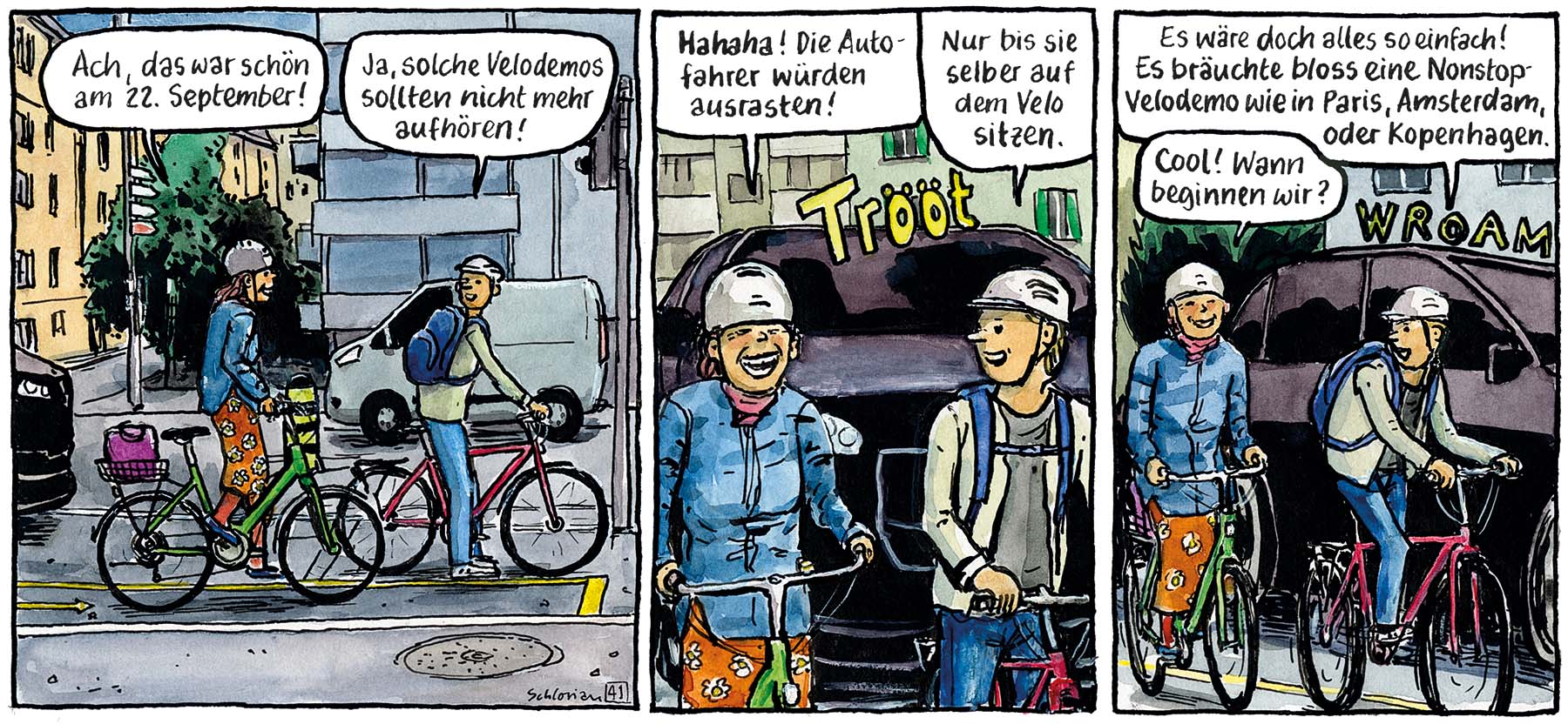 Ach wie schön wäre es, gäbe es jeden Tag eine Velodemo wie am 22. September. Schlorian sinniert darüber, wie der Veloverkehr dann aussehen würde.